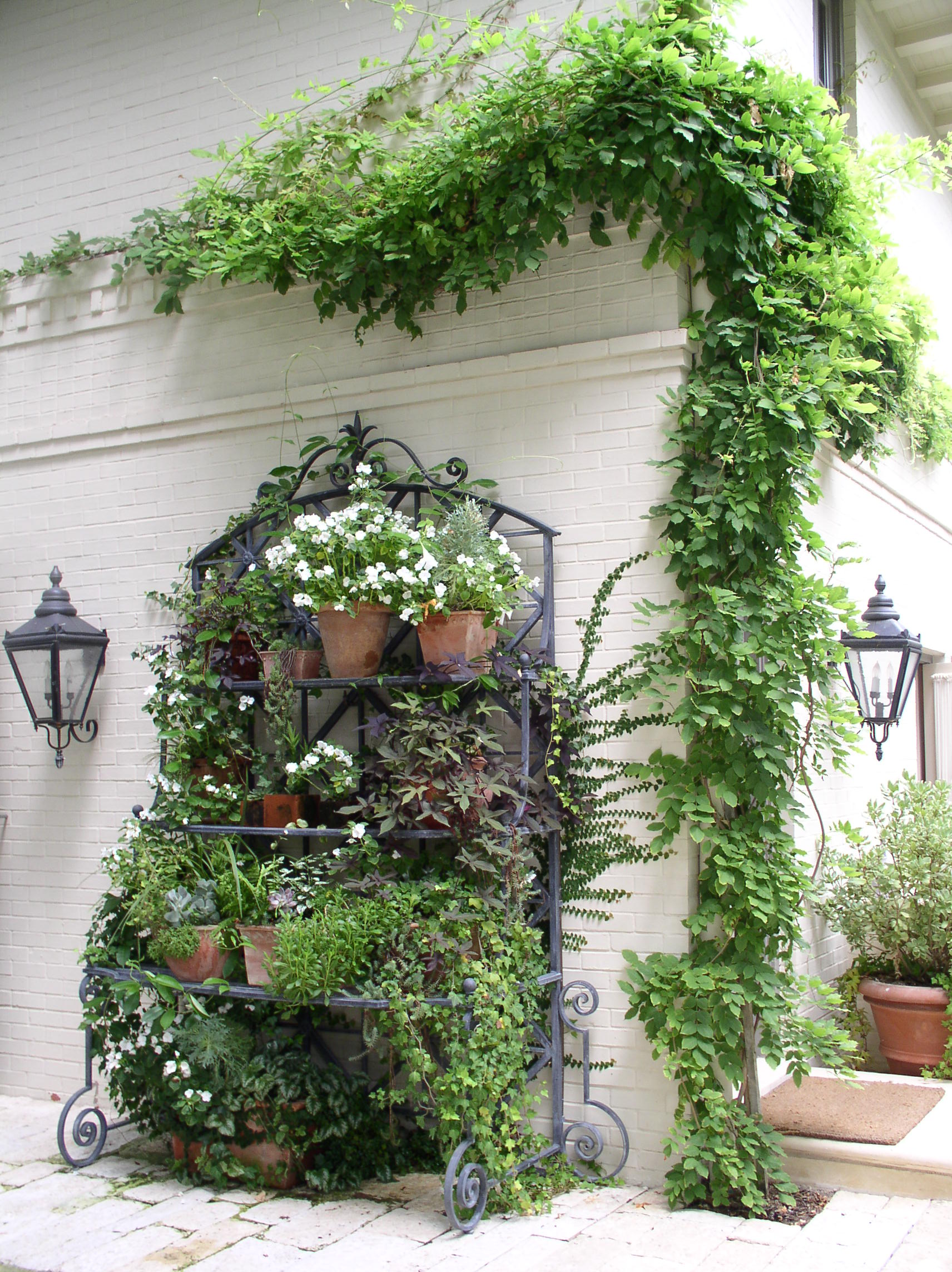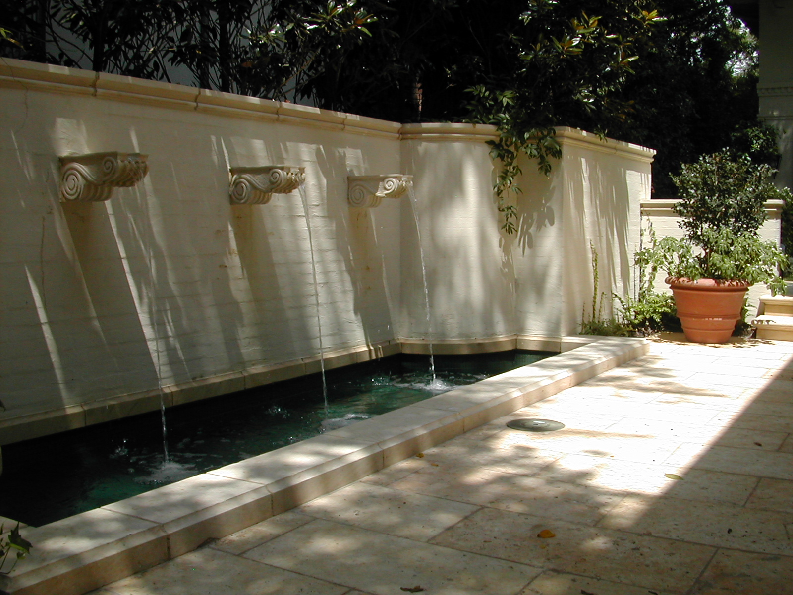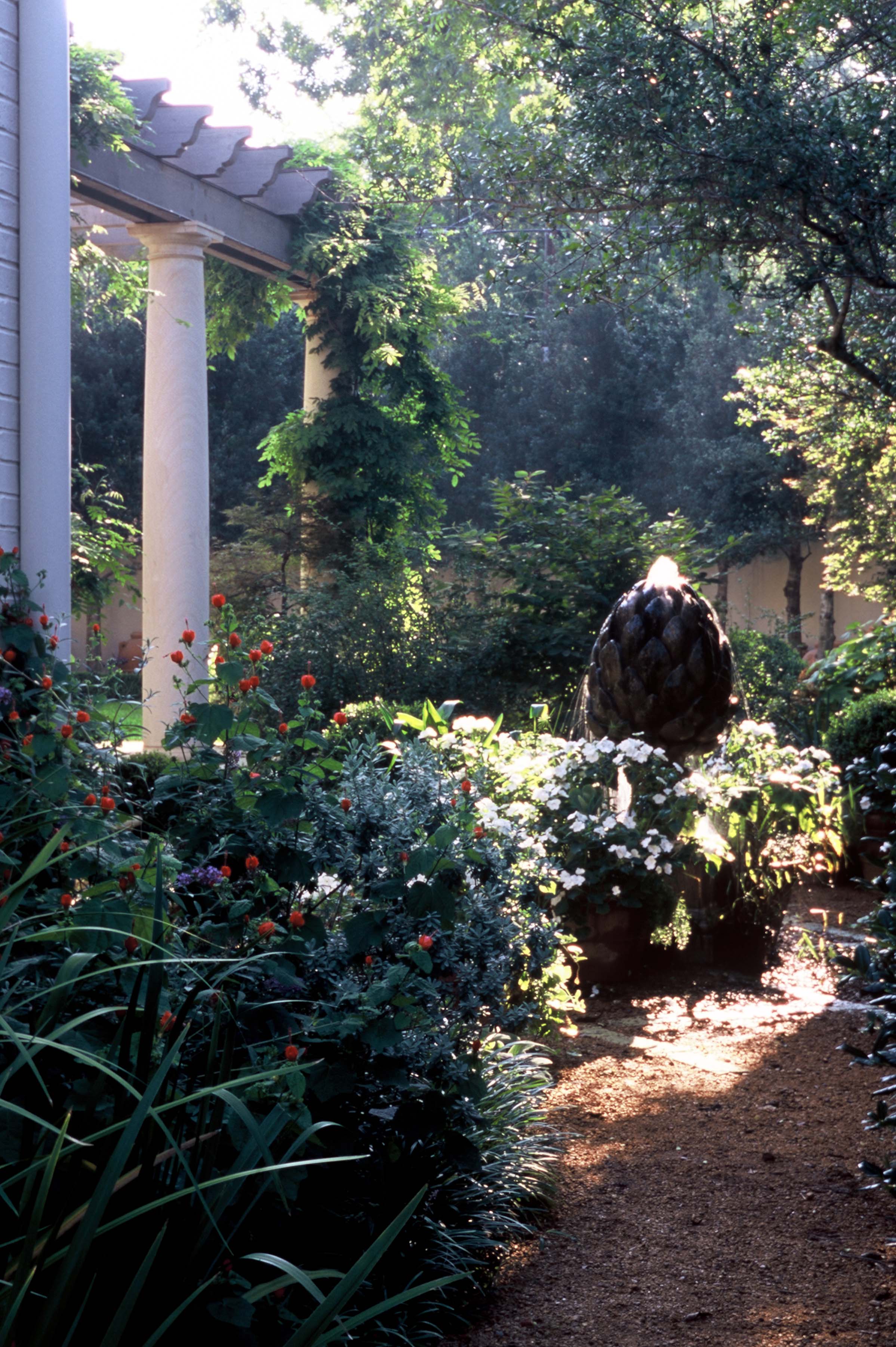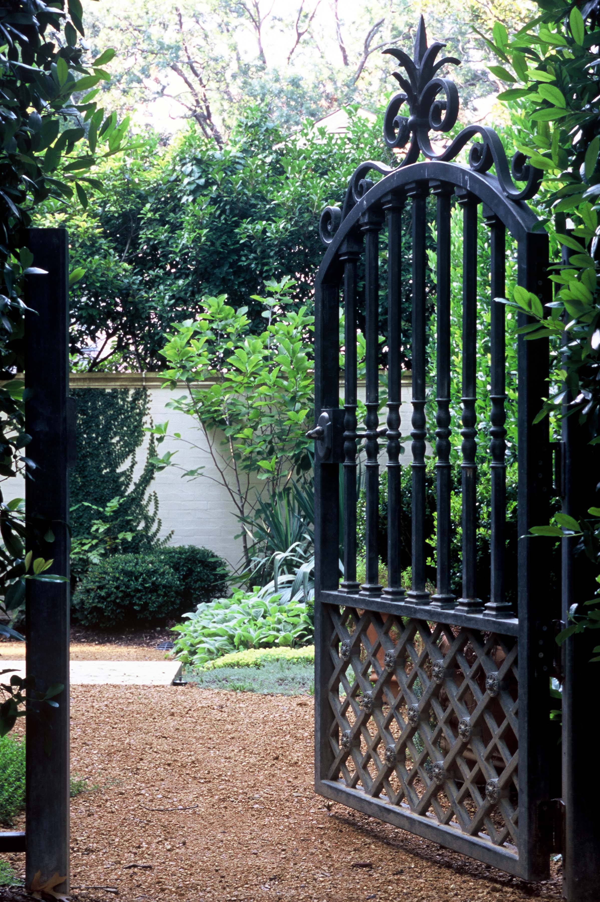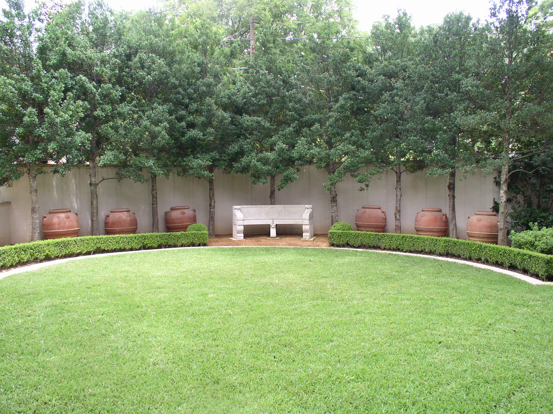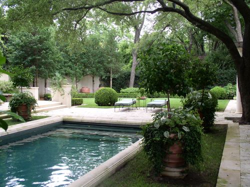 Nestled beneath magnificent mature oaks, this Mediterranean-style home and garden are a symbol of understated elegance. Meticulously renovated, this residence is surrounded by a new garden that complements seamlessly and blurs the line between interior and exterior living spaces. All site details were thoroughly thought through including our being asked by client to aid in color selections for house paint and stain to blend with landscape materials, including various limestones and lead and iron garden ornaments. Landscape masonry walls were slathered with plaster so as not to detract from the brick detailing of the house.